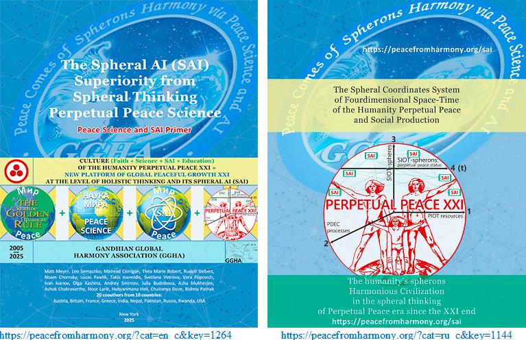 Perpetual Peace: Three World Discoveries Dear peacemakers-coauthors, We can happily congratulate each other today on our "Peace Science Primer" (PSP) pilot publication in Russian, in PDF, 130 pages (https://peacefromharmony.org/?cat=ru_c&key=1120) with three world scientific discoveries of perpetual peace, listed in the book title: spheral AI (SAI), spheral peace science and spheral thinking. As objective truths, they are immortal for the future humanity perpetual peace, which begins with them today in our Primer book: https://peacefromharmony.org/?cat=en_c&key=1288 Along with this, we have updated our banner for the US-Russia summit, if not for the first one, in Alaska, then for the next one, promised by President Trump. The perpetual peace scale is not limited to one country, but it can begin with it, as we propose in our PSP. For its publication in Russian, we must thank our permanent technical director and designer for 20 years Ivan Ivanov. Our huge thank to him for his excellent and great work with the PSP layout. Now we have the road open for finishing the English Primer, which is 75% ready thanks to Lukas Pawlik’s efforts, who edited all 10 of its chapters, and which I will now begin to publish on the website and assemble into a layout for publication in October. Let us hope that thanks of our American coauthors efforts, who could send our banner to President Trump's team, our Primer with three world discoveries for perpetual peace will not remain without the two powers leaders attention, at least at their next summit. We, like the whole world, hope for their success and contribute to it as best we can, opening the scientific path to perpetual peace with its three discoveries, without which it cannot and has not been as well as freedom from nuclear and other wars. With peace, love and gratitude to all coauthors for your immortal contribution, Leo Semashko https://peacefromharmony.org/?cat=en_c&key=253 14-08-25 ------------------------------